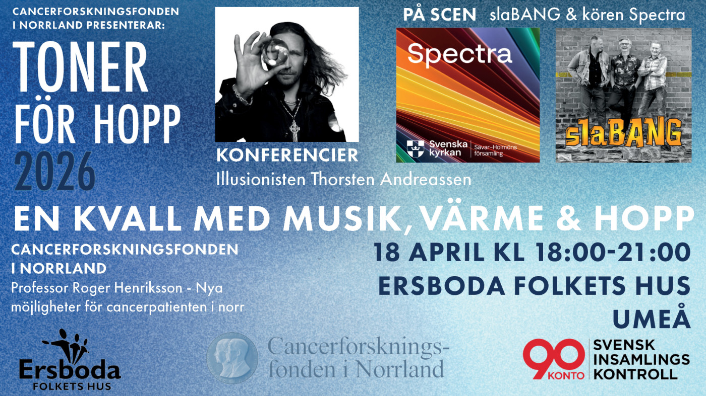 Vi bjuds på musikunderhållning av slaBANG och kören Spectra. Professor Roger Henriksson berättar om nya möjligheter för cancerpatienten i norr. Kvällens konferencier är illusionisten Thorsten Andreassen.